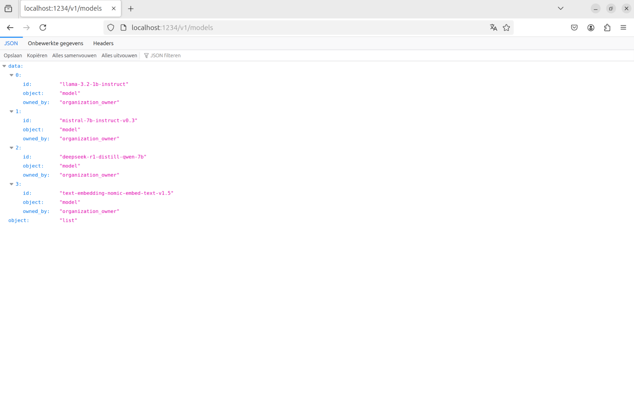 Dit stuurt een vraag naar het lokale LLM en print het antwoord.